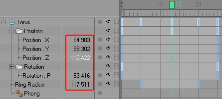 Activez cette option pour ajouter une colonne supplémentaire dans la ligne temporelle, dans laquelle sera affichée à la position temporelle active dans l'animation la valeur de piste interpolée pour chaque piste d'animation pouvant être interpolée. Si le curseur temporel se trouve sur une clé, la valeur de piste correspondante sera affichée en surbrillance (pour cet exemple, il s'agira de la valeur de clé).