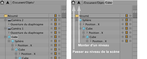 Comme les arborescences hiérarchiques de la zone Objets peuvent devenir très complexes lors d'un travail avec des animations importantes, chaque branche peut être définie comme racine (Définir comme racine), ce qui permet de n'afficher qu'une seule branche hiérarchique. Ce chemin hiérarchique sera affiché dans la Barre d'accès, pour vous permettre de vous repérer dans la hiérarchie principale. Les pistes ne peuvent pas être définies comme racines (à l'exception des pistes de préférences de rendu et d'effets de post-production).
