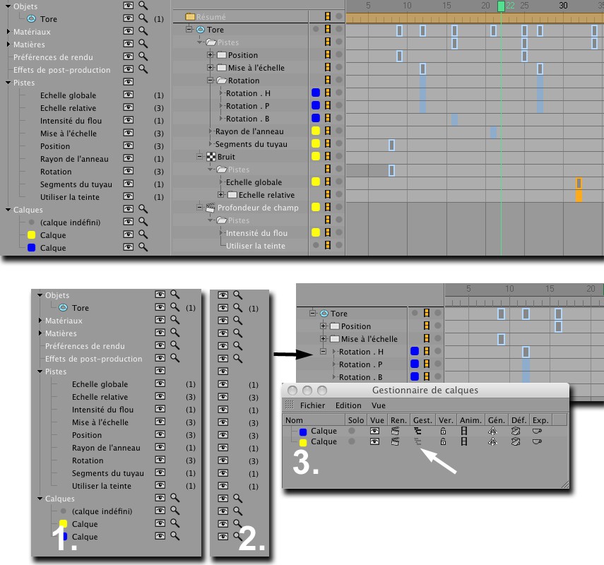 Il est possible de nettoyer des lignes temporelles complexes en utilisant des filtres. En haut : ligne temporelle complexe dans son état original. En bas : utilisation de deux paramètres de filtres et d'un paramètre de calque pour obtenir le même résultat. Dans l'exemple 1, les éléments et les pistes correspondantes ont été masquées. Dans l'exemple 2, tous les calques non significatifs ont été masqués. Dans l'exemple 3, les interrupteurs ont été désactivés dans le gestionnaire de calques pour clarifier la ligne temporelle.
