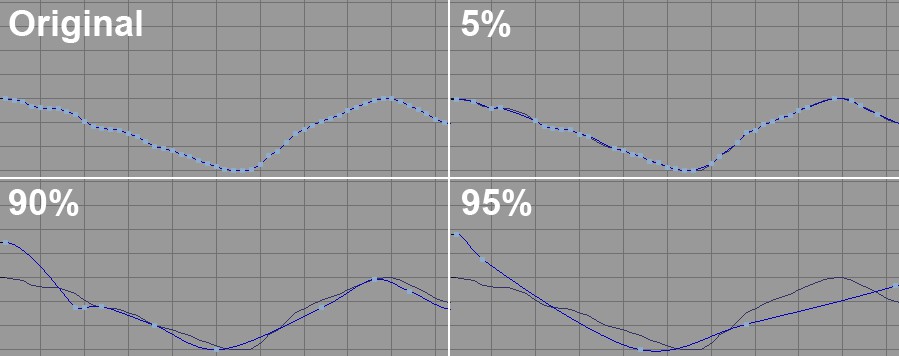 Mode Courbe. Dans le sens des aiguilles d’une montre, à partir de l'angle supérieur gauche : la courbe originale et les effets des valeurs de réduction. Notez que le nombre de clés diminue avec l'augmentation de la valeur de réduction.