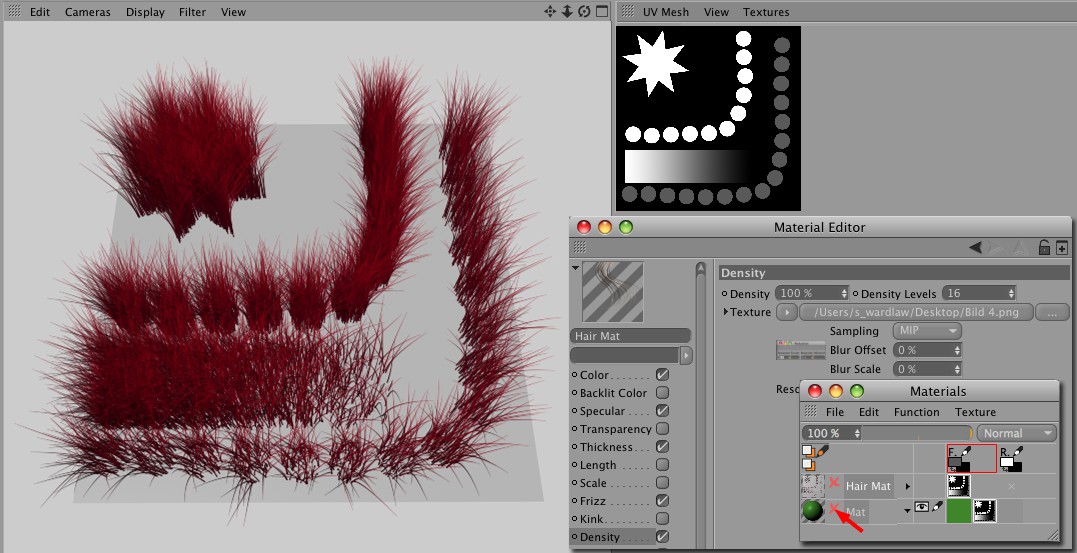 Peignez la densité des cheveux en utiisant les canaux de matériaux personnalisés. Assurez-vous que le canal de matériaux du matériau soit activé dans le gestionnaire de matériaux.