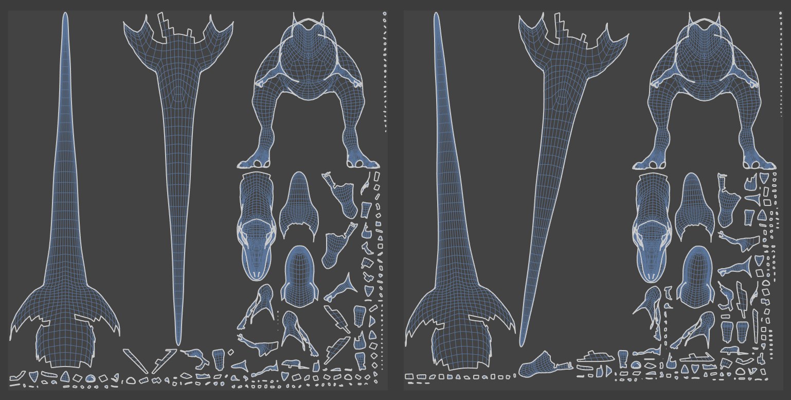 À gauche : une valeur faible pour Autoriser étirement ; à droite : une valeur plus élevée. Le maillage UV couvre 10 points de pourcentage de plus de surface de texture .