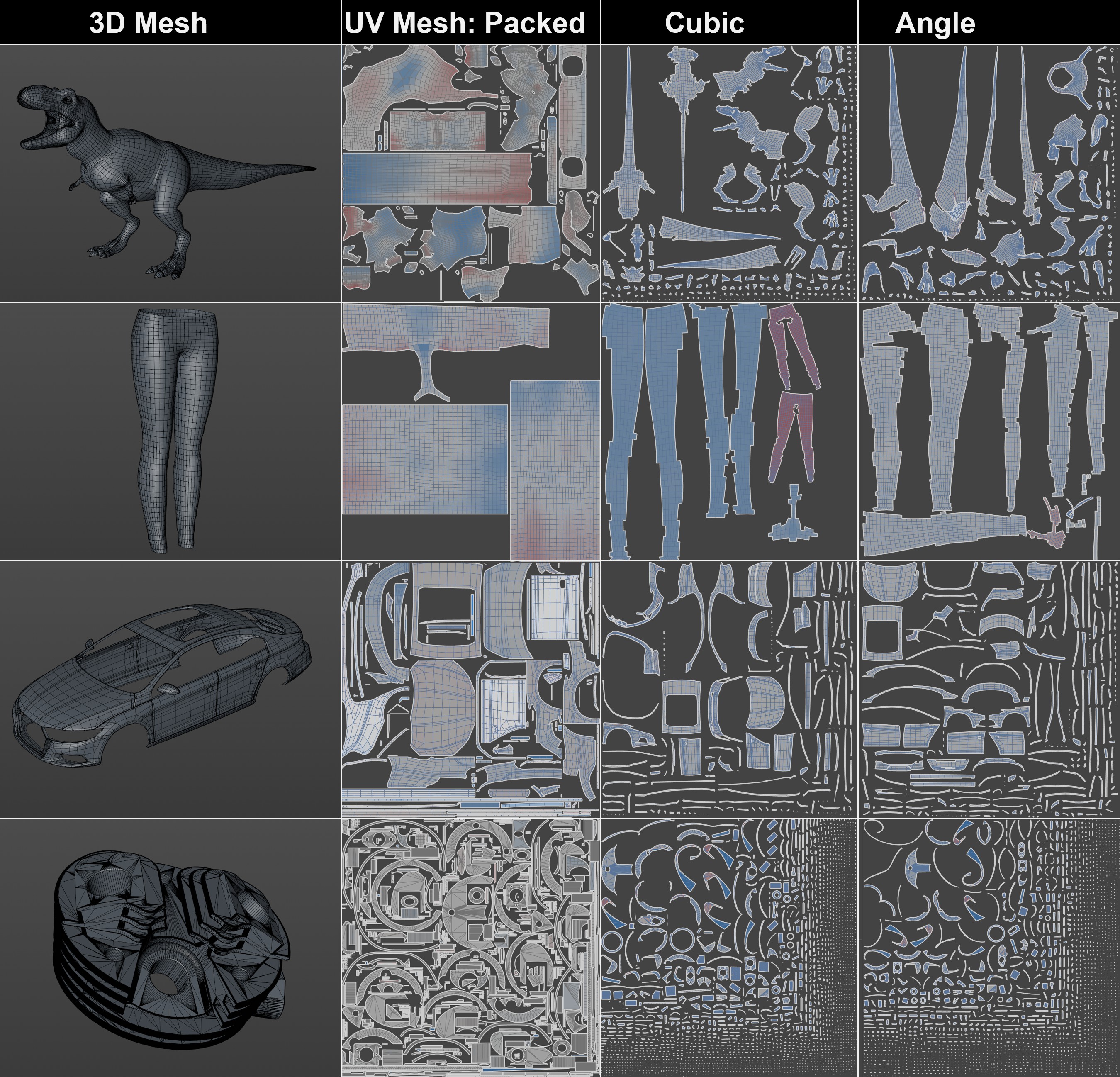 Cet algorithme fait plusieurs choses à la fois : il divise le maillage UV en autant d’îlots UV que possible, avec le moins de déformation possible et une mise à l’échelle de la géométrie 3D aussi précise que possible. L’algorithme peut reconnaître les sections cylindriques ou coniques et peut les déplier. Les contours en bandes seront également reconnus et dépliés en conséquence. Un certain nombre d’autres fonctions utiles sont également incluses et exécutées automatiquement.