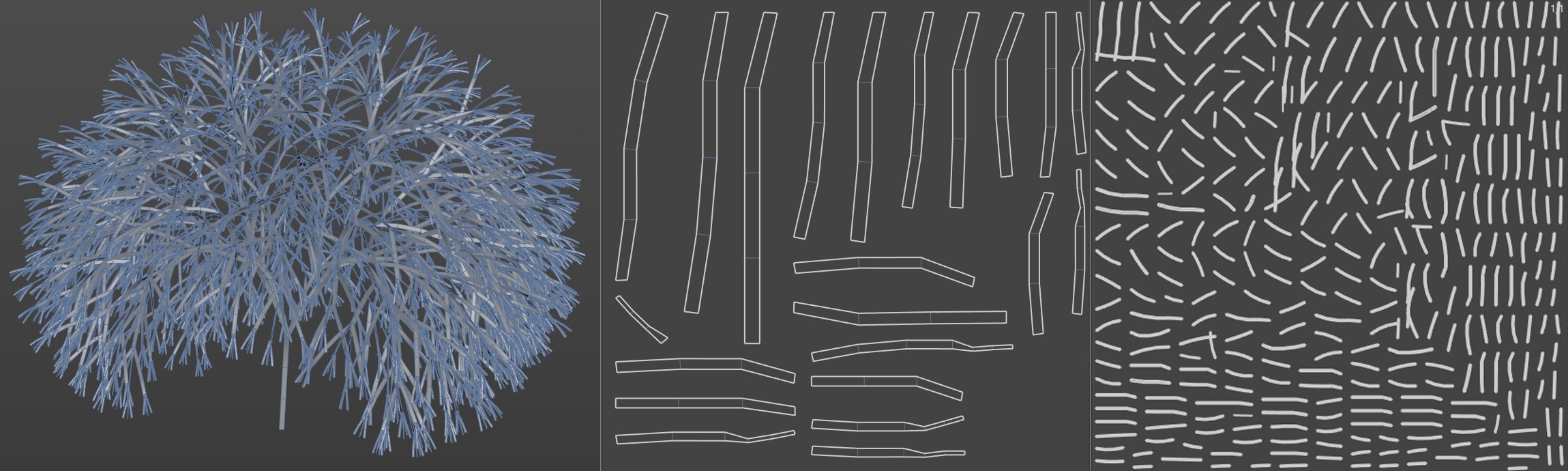 Superposer une Géométrie identique activé au centre, désactivé à droite. Cette option permettait de réduire l’arbre (initialement Turtle MoSpline dans un objet Extrusion contrôlée) à ses bandes polygonales répétées et d’empiler des îlots UV identiques.