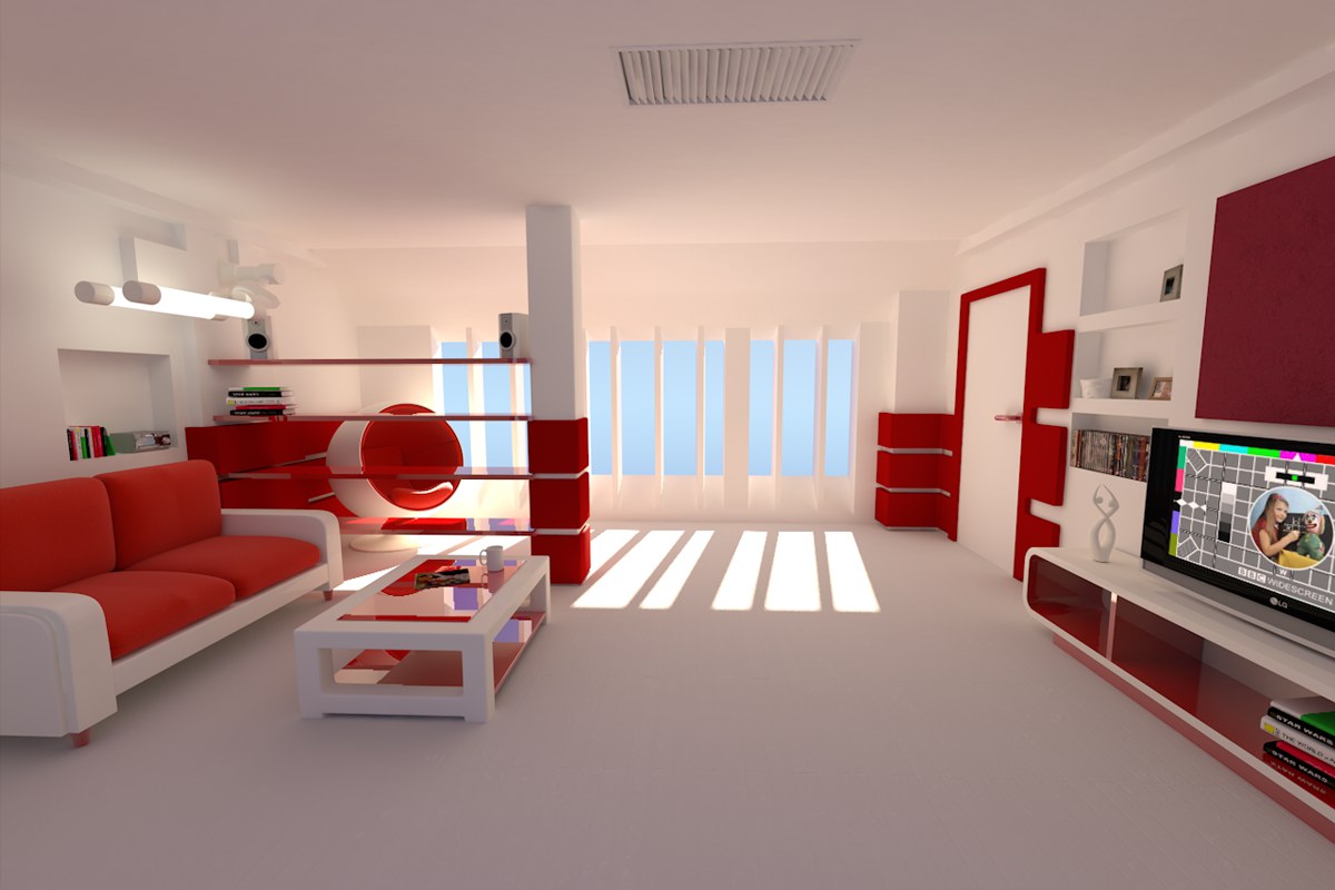 Les deux lumières polygonales (objets avec un matériau lumineux appliqué) sur le mur à gauche globale influence très peu l'éclairage de la pièce. La quantité de lumière émise par la télévision à droite ne joue aucun rôle.