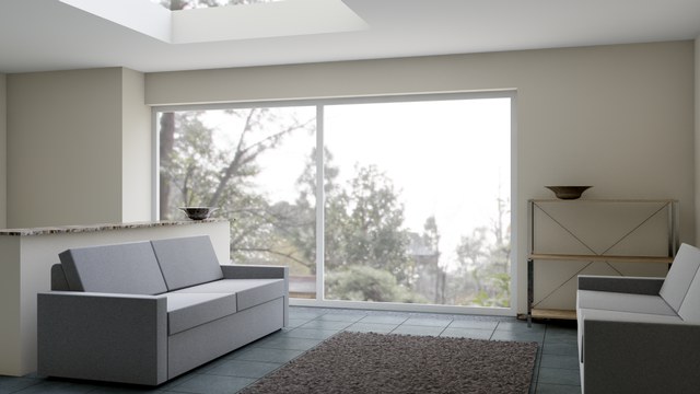 Cette chambre dispose de deux grandes ouvertures à travers laquelle la lumière peut entrer - la lucarne dans le plafond et la fenêtre. Les deux ouvertures ont été définis comme Portails IG afin de concentrer les calculs d’IG dans les zones à droite. La lumière est générée par l'intermédiaire d'une texture HDRI sur l’ Objet Ciel.