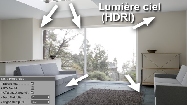 Ce qui distingue cette scène , en plus de la dispersion de la réflexion des lattes de plancher et le déplacement généré pour le tapis, est l'éclairage HDRI qui a été utilisé.