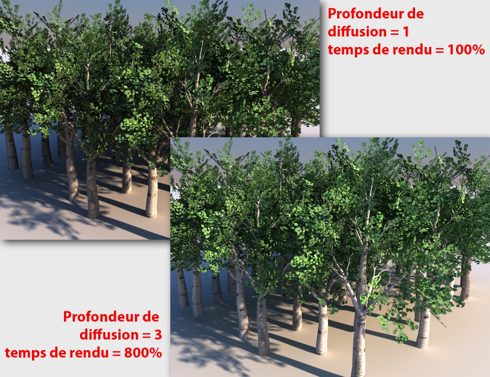 A gauche: Profondeur de diffusion = 1; à droite: Profondeur de diffusion = 3. La différence visible est minime, mais les temps de rendu sont augmentés.