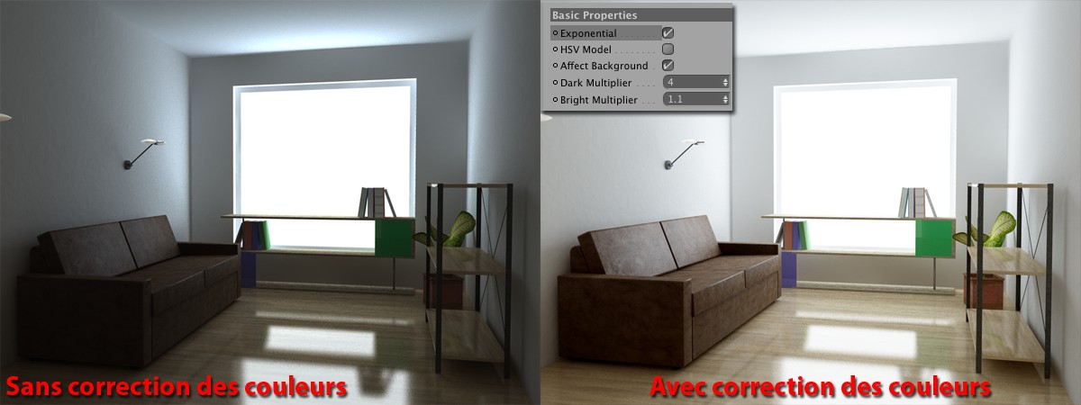 A gauche un rendu classiue 8 bits; à droite une image rendue avec projection des couleurs. La seule source de lumière est une lumière polygonale (objet avec matériau lumineux appliqué). Scène de Holger Schömann.