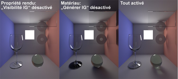 - ou dans le canal illumination d’un matériau (option Recevoir IG ou Générer IG pour les caustiques), ce qui vous permet de "bloquer” la IG pour certains matériaux (ce qui est fait automatiquement pour les matériaux transparents avec Recevoir IG, voir aussi optimisation verre/miroir).