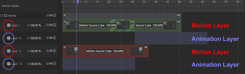 Les calques d’animation peuvent également être facilement combinés et mélangés avec des calques de mouvement et leurs clips. Par exemple, les animations enregistréss dans une source peuvent être facilement variées ou être modifiées ultérieurement.