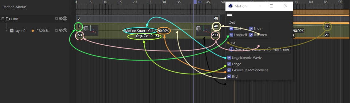 Si cette option est activée, les propriétés du calque peuvent être animées directement et interactivement via les courbes F du calque de mouvement ou du calque d’animation. L’option Courbe F dans le calque de mouvement du menu doit, cependant, être activée.