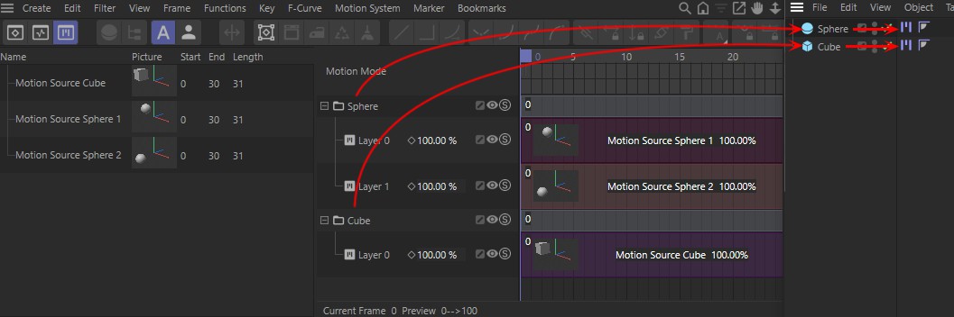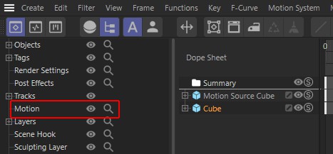 La ligne de temps va passer en mode Mouvement. À gauche de la ligne, vous verrez une nouvelle source de mouvement et l'animation enregistrée de votre cube avec le nom vous lui avez assignée.