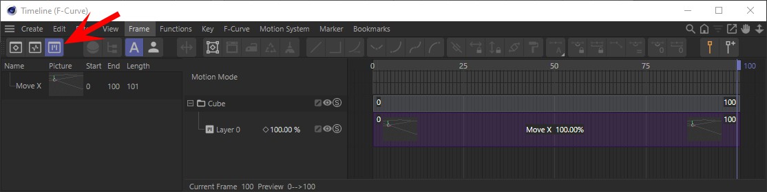 Comme dit plus tôt, la Ligne temporelle reçoit un nouveau mode, spécialement créé pour travailler avec le Système de mouvement. En plus des modes Feuille d'exposition et FC, vous avez également le mode Mouvement (.