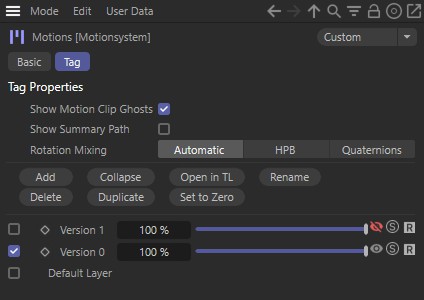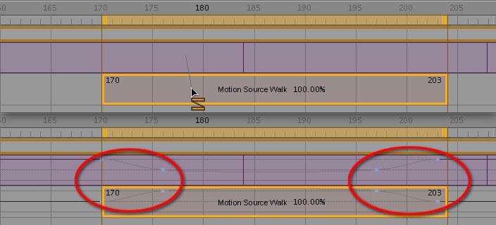 Le Système de mouvement de CINEMA 4D est un système intégré d’animation non-linéaire (NLA). Ce terme peut être déjà familier pour les utilisateurs de logiciels d’édition vidéo. Le NLA autorise des segments individuels d’animation, appelés "clips de mouvement”, qui peuvent être mixés de différentes manières. Ces clips peuvent être fondus en entrée ou en sortie, bouclés, déplacés et dimensionnés temporellement et modifiés via des courbes. Cela peut être fait pour des objets individuels ou une hiérarchie complète d’objets, ex. une hiérarchie d’articulations de personnage ou les contraintes qui contrôlent le personnage.