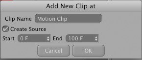 - Sélectionnez l'option Ajouter clip de mouvement... dans le menu et spécifiez un nom pour le nouveau clip. Laissez tous les autres paramètres inchangés et cliquez sur "OK".