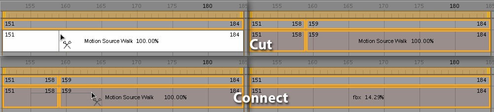 La sélection de cette commande active un outil qui vous permet de scinder un clip en deux clips distincts. Avec le même outil, deux clips juxtaposés peuvent être connectés en un seul clip. Pour ce faire, cliquez sur l’un des clips et glissez le sur le second clip. Dès que vous relâchez le bouton de la souris, les deux clips seront fondus en un seul. Une nouvelle source, constituée des informations d’animation des deux clips, sera créée.