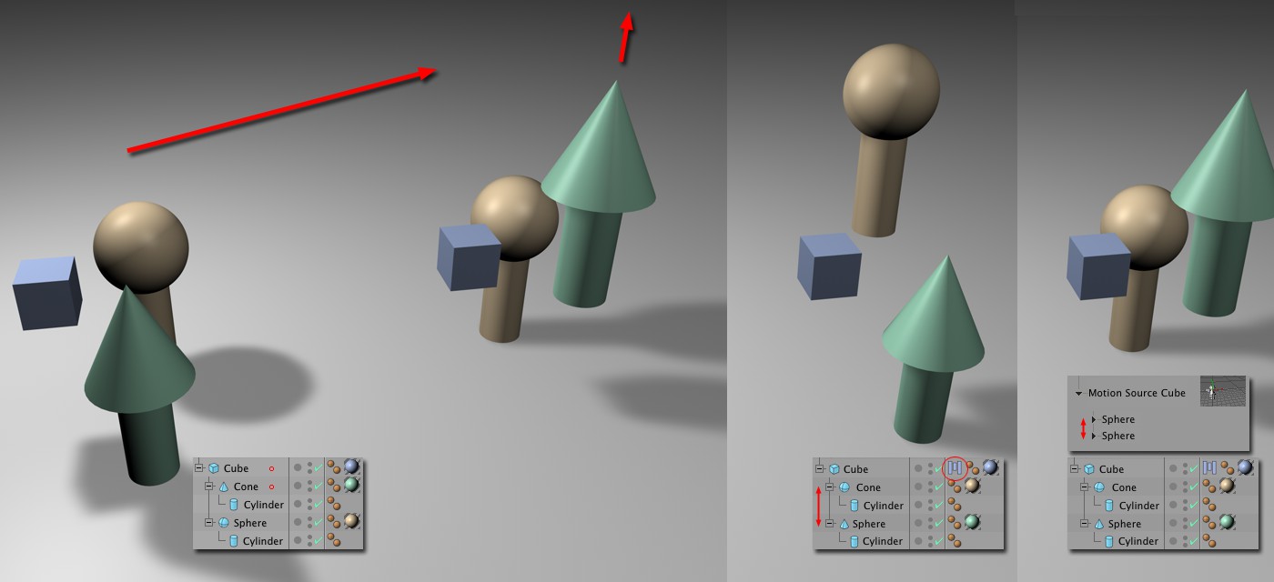Ce qui s'est passé, c'est que l'animation a été déplacée dans la source, qui à son tour a été affectée à un nouveau clip qui affecte le cube. Grâce à l’influence du clip sur le cube, le mouvement en avant de ce dernier est identique à la source. Le cube se déplace exactement comme avant.