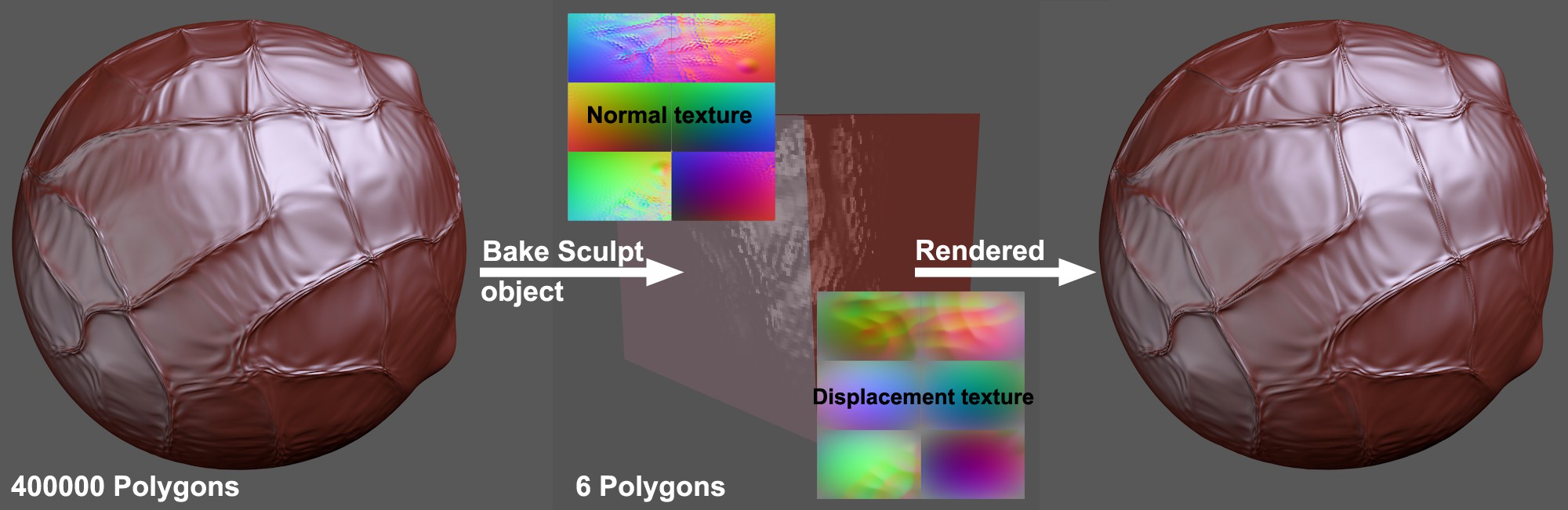 Que se passe-t-il concrètement lorsqu’un objet sculpté est conformé ? Les détails d’un objet haute résolution (objets source) sont transférés via une texture sur un objet basse résolution (objet cible).