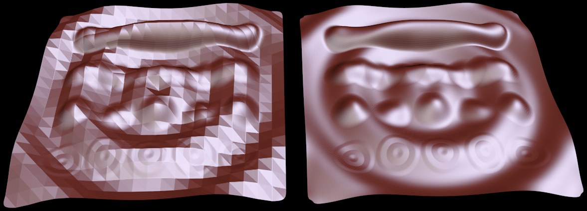 Lorsqu’un objet (texture de déplacement) conformé est déformé à l’aide d’un déformateur, des effets indésirables peuvent se produire (voir image ci-dessus). Dans ce cas, désactivez l’option Arrondir la géométrie. La texture de déplacement sera conformée de façon minimale et l’option Arrondir la géométrie sera activée plus tard dans le canal de déplacement.