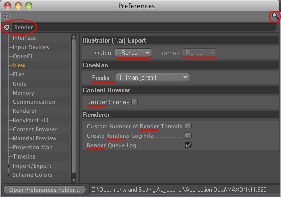 En bas de la fenêtre de dialogue des préférences vous avez le bouton Ouvrir dossier des préférences...: les préférences de programme et toutes les données utilisateur spécifiques (bibliothèques, etc) sont enregistrées dans un dossier CINEMA 4D (dont le nom correspond au numéro de la version) à en endroit défini par votre système opérateur (et non plus dans le répertoire de programmes de CINEMA 4D comme dans les versions précédentes). Cet endroit s'ouvrira dans votre fenêtre Explorateur/localisateur lorsque vous cliquerez sur le bouton Ouvrir dossier des préférences....
