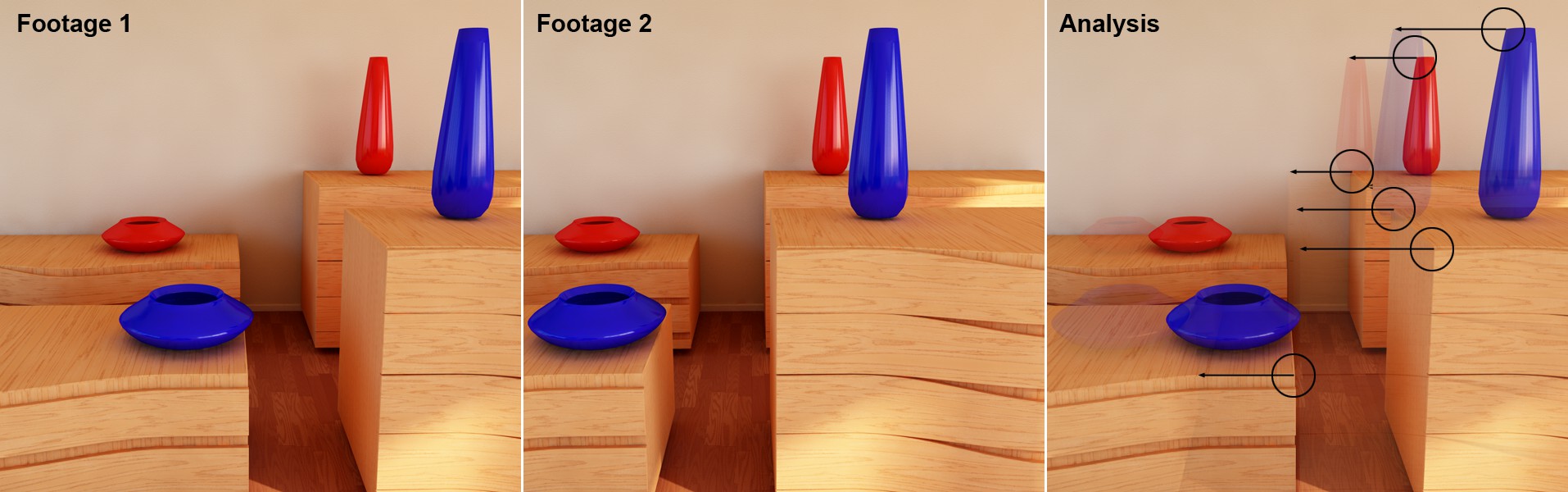 Observez la différence entre la vidéo 1 et la vidéo 2 dans l’image ci-dessus. La caméra se déplace à l’horizontale de gauche à droite. Le vase rouge au fond semble se déplacer sur une plus petite distance (voir la longueur de la flèche) que le vase bleu. Ces différences entre les parallaxes peuvent être utilisées pour définir une position correspondante dans l’espace 3D (que nous définirons désormais sour le nom de piste) par rapport à la caméra.