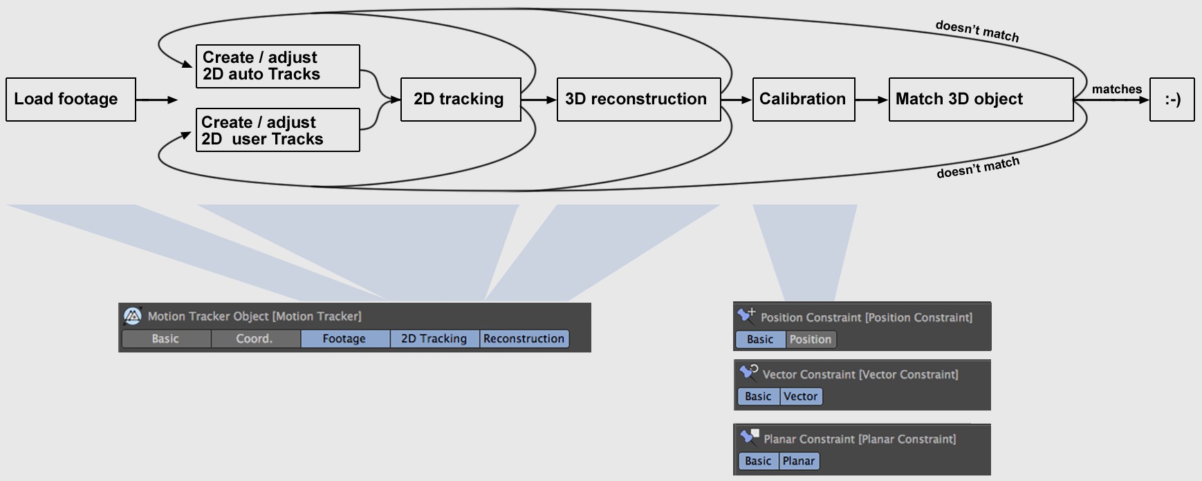 Le traqueur de mouvements est basé sur l’analyse et le tracking (pistage ou traquage) de points marqués (pistes) dans la vidéo originale. Les positions dans l’espace 3D peuvent être calculées à partir des différentes vitesses de mouvement de ces pistes en fonction de leur distance par rapport à la caméra (cet effet s’appelle le défilement parallaxe).