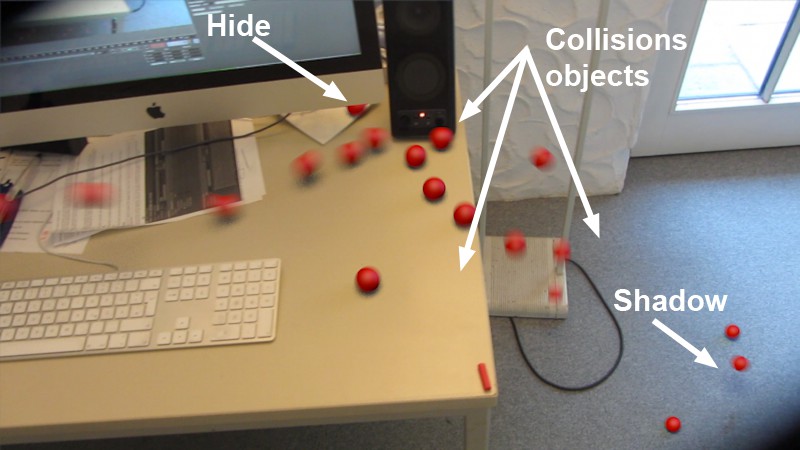 Dans cet exemple, un émetteur lance des sphères sur une table ; celles-ci roulent vers le bord de la table, se heurtent à l’enceinte et tombent sur le sol. Cette scène utilise des objets proxy (invisibles) qui servent d’objets de collision pour la simulation dynamique et, dans le cas du moniteur, masquent les sphères situées derrière :
