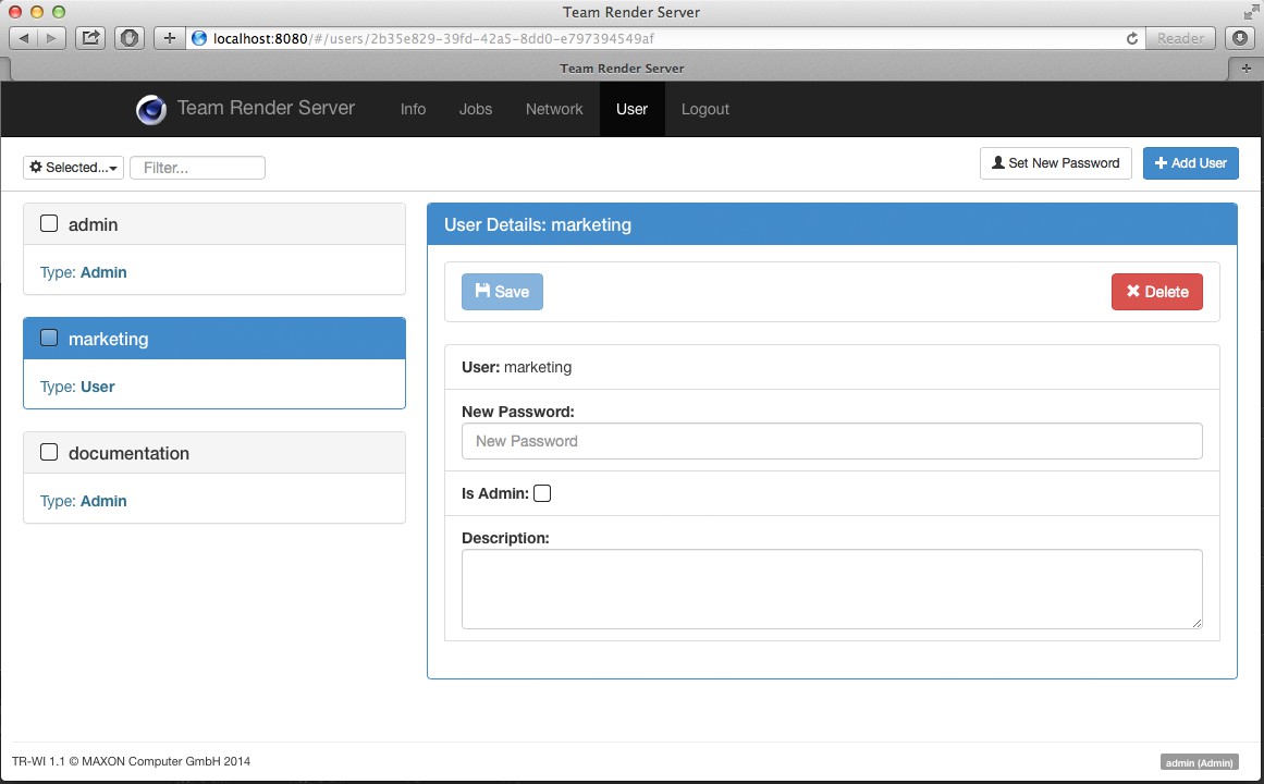 Une fois l'utilisateur ajouté, il/elle pourra se connecter au serveur Team Render grâce aux informations fournies (adresse navigateur : voir Interface du navigateur) et pourra réaliser des rendus.