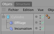 Si l'objet à déformer est sélectionné lorsque le déformateur est appelé et que la touche Shift est enfoncée (voir également les raccourcis pour travailler dans le gestionnaire d'objets), le déformateur correspondant est activé.