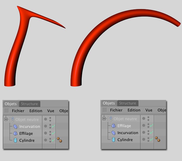 Les objets de déformation peuvent également être combinés entre eux. La règle suivante s'applique : si les objets déformateurs de la hiérarchie sont au même niveau, le premier objet de la séquence est appliqué à l'objet à déformer en premier. Comprimer d'abord un objet et le plier ensuite produit un effet différent de l'inverse.