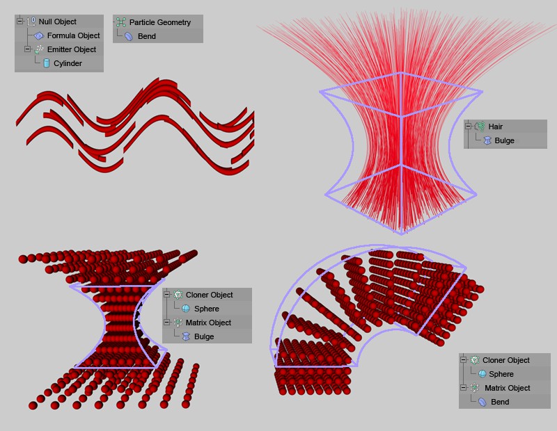 En haut : effet sur les particules, les cheveux (cheveux en tant que géométrie), en bas : effet de deux objets déformateurs différents sur des clones MoGraph dans un arrangement en grille.