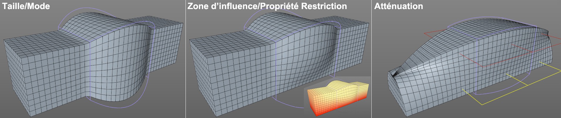 Les déformateurs d'incurvation , de dilatation/Compression, de torsion, d'effilage et d'inclinaison indiquent les directions dans lesquelles ils agissent avec leur aperçu.