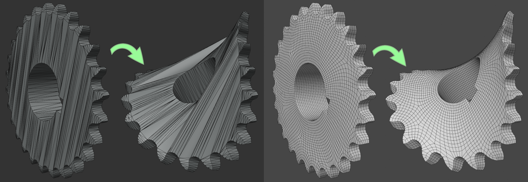 Les objets importés de programmes plus techniques sont souvent pourvus de triangles très longs qui réagissent mal lorsqu'ils sont déformés, comme on peut le voir ici à gauche :