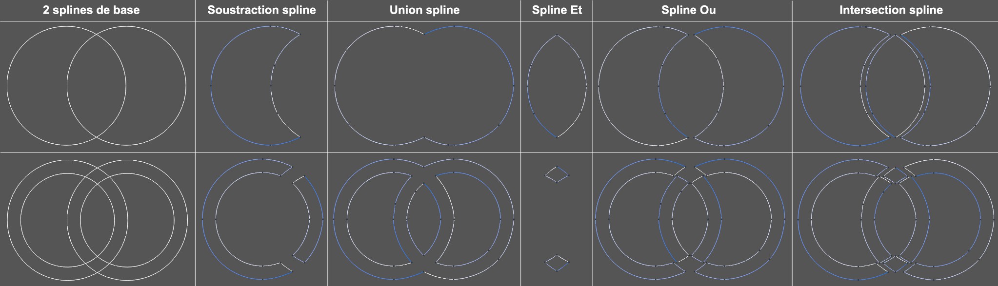 Les 5 commandes et leurs résultats respectifs lors de leur application sur 2 splines qui se croisent (en bas : splines supprimées avec chacune deux segments). Dans les deux dernières colonnes, les segments de splines ont ensuite été légèrement déplacées afin de créer des segments, qui doivent normalement se situer les uns sur les autres, ce qui permet de mieux les distinguer.