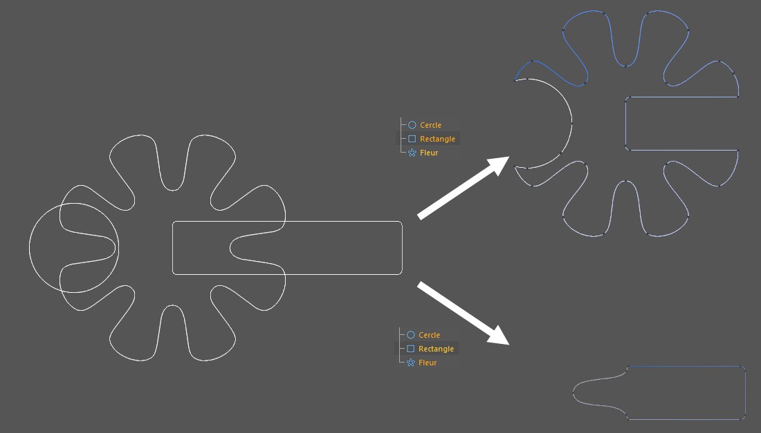 À noter que l'ordre général de sélection de toutes les splines impliquées dans une opération de ce type peut aussi avoir un effet sur l'ordre des points de la spline produite. (Est-il préférable de détacher le cercle ou le rectangle de la fleur en premier ? Dans l'exemple ci-dessus, le cercle était le premier à être détaché et la spline qui en résulte commence également sur le cercle.).