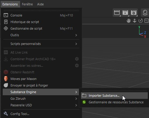Dans le menu Extensions de Cinema 4D, vous trouverez les commandes permettant de charger de nouvelles ressources Substance 3D et d'ouvrir le gestionnaire de ressources Substance.