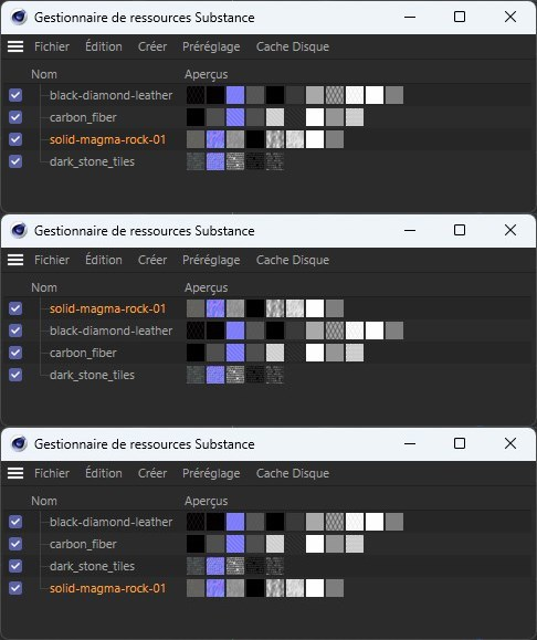 Le gestionnaire de substances contient et gère toutes les substances chargées en tant que ressources. Vous pouvez fermer ce gestionnaire à tout moment et l'afficher à nouveau via Extensions/SubstanceEngine/SubstanceAssetManager..... Toutes les entrées de la liste peuvent être réorganisées ici par glisser-déposer, par exemple, et sélectionnées de la manière habituelle(Ctrl/Cmd pour ajouter ou supprimer des entrées individuelles de la sélection, Shift pour sélectionner des zones entières, Delete pour les supprimer). Comme le montre l'illustration ci-dessus, le tri automatique par ordre croissant ou décroissant peut également être appelé en cliquant sur Nom au-dessus de la colonne de gauche. Toutefois, dans ces modes de tri, il n'est plus possible de procéder à un nouveau tri individuel par glisser-déposer.
