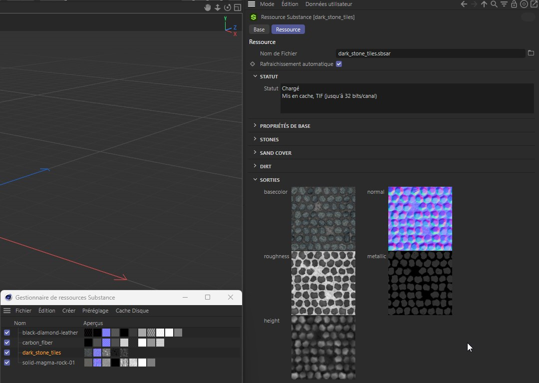 Cela permet de charger une nouvelle ressource dans Cinema 4D (vous pouvez également faire glisser et déposer les fichiers correspondants dans le gestionnaire de ressources de Substance ). Un fichier de substance correspondant doit avoir l'extension *.sbsar. En fonction du préréglage du moteur de substance, un matériau lié sera également créé directement.