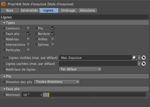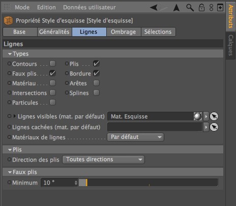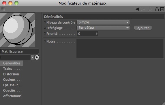 Le matériau automatiquement ajouté après l’activation de l’effet de post-production est le matériau Esquisse. Ce matériau contrôle l’aspect des lignes (couleur et épaisseur). Succinctement, le matériau Esquisse est le matériau utilisé par l’effet de post-production pour le tracé des lignes.
