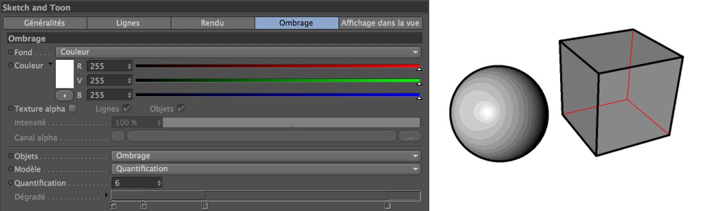 Cet effet de post-production contrôle donc notamment quels matériaux Esquisse seront utilisés dans la scène pour le rendu des lignes visibles et cachées. Avant de passer à l’étape suivante, notez le nombre de bandes de luminosité composant la texture de la sphère. Nous allons maintenant changer ce nombre.