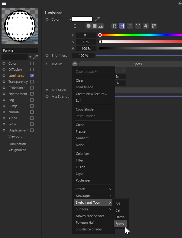 Le module Sketch and Toon est équipé de quatre puissantes matières de canal f0 : Artistique, Cellulo, Hachures et Trame. Ces matières permettent de créer une infinité d’effets. Vous pouvez les utiliser dans tout canal de matériau acceptant une texture, mais elles sont particulièrement adaptées au canal de Luminescence.
