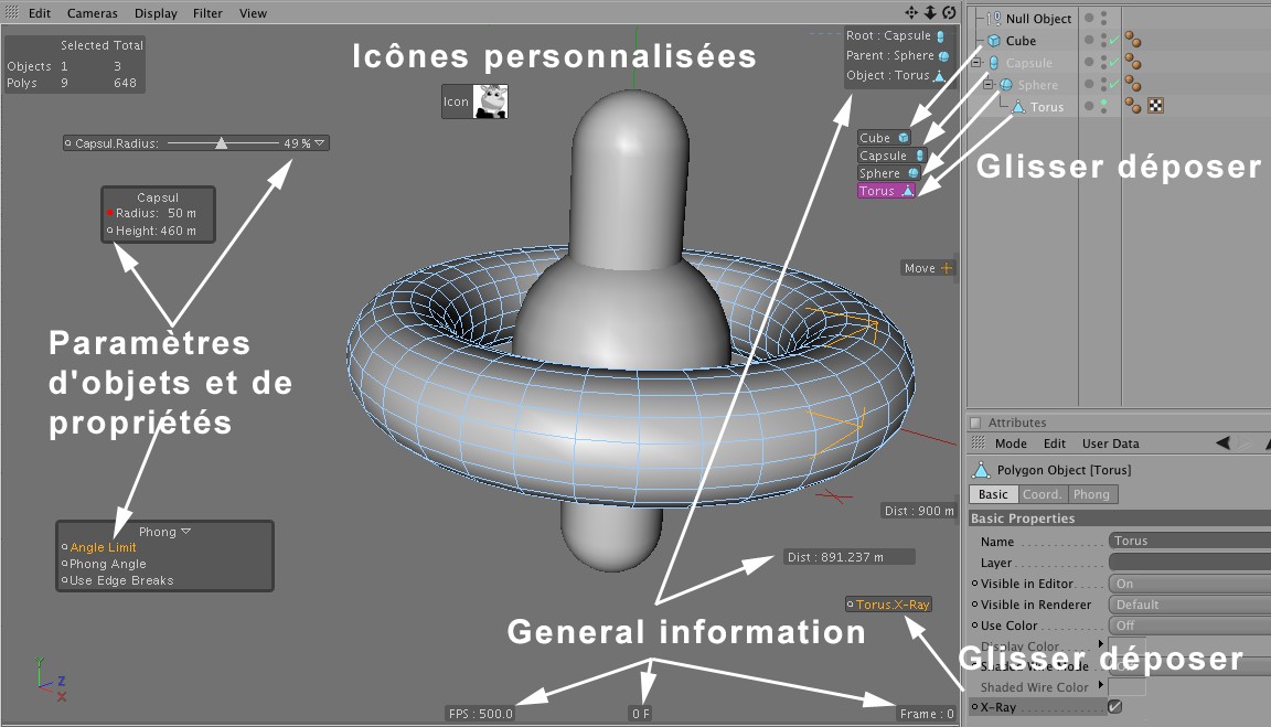 Charger une icône : lorsqu'un objet est sélectionné dans le gestionnaire d'objets et déposé directement dans la vue, un élément d'interface est affiché avec l'icône de l'objet. Cette icône peut être remplacée par une icône personnalisée. Vous pouvez utiliser tout format d'image reconnu par Cinema 4D pour la création de votre icône personnalisée. Tous les canaux alpha de l'image seront appliqués.