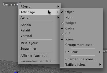Vous trouverez ici les mêmes commandes que celles du menu contextuel du gestionnaire d’attributs Animation. L’affichage frontal peut, par exemple, être utilisé pour créer des images-clé, supprimer des pistes et passer d’une image-clé à une autre.