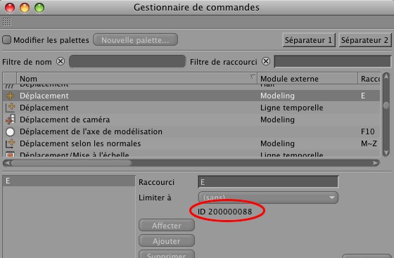 Commande : lorsque vous cliquez sur cet assistant de sélection, une commande (ou un script) Cinema 4D de votre choix est exécuté en plus de la sélection de l'élément. Référez-vous au Gestionnaire de Commandes Personnalisées pour les ID de commandes disponibles (entrez le numéro d'ID dans le champ ID) :