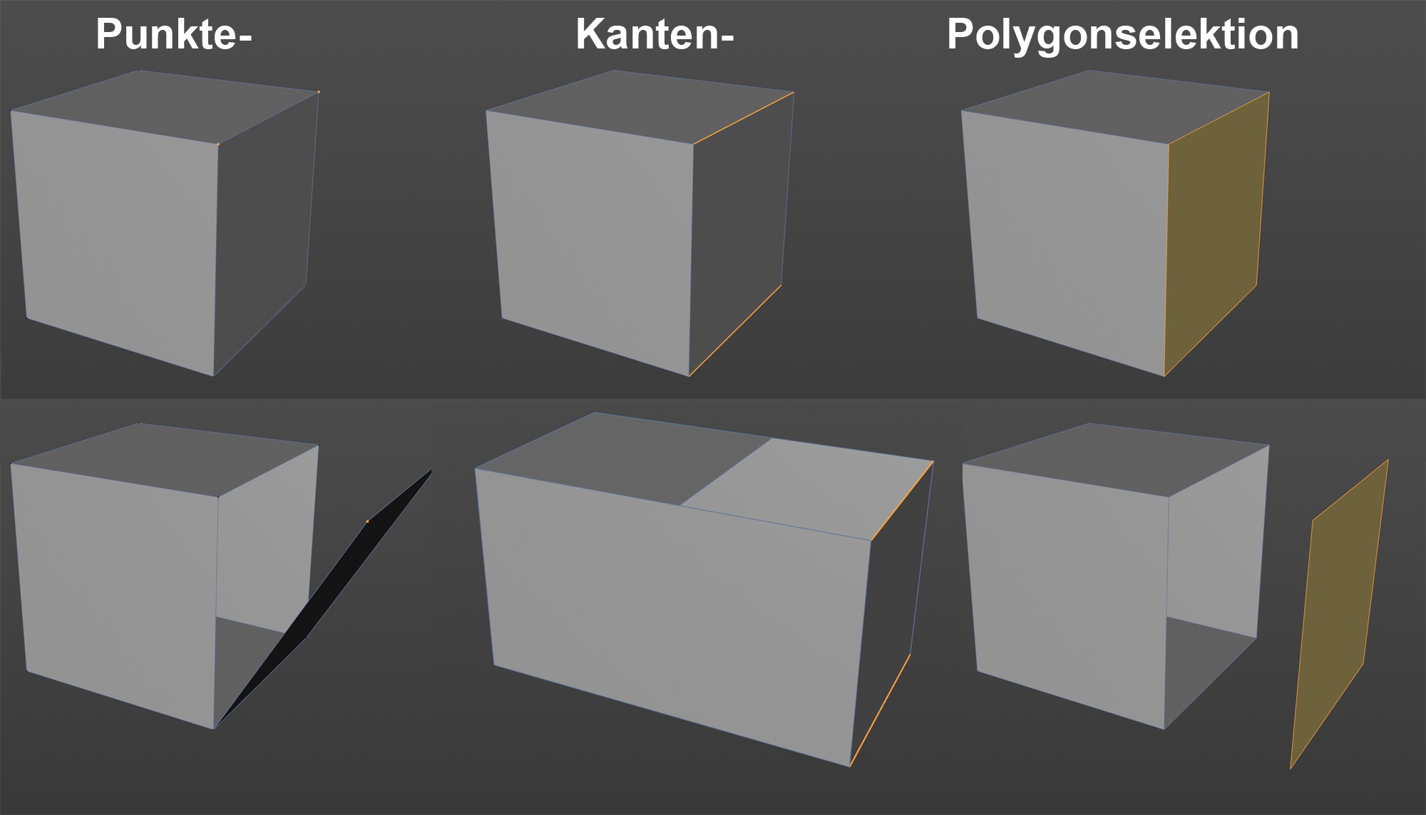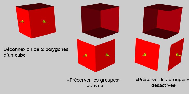 Si cette option est activée, les éléments sont séparés de l’objet en un seul bloc (s’ils étaient connexes avant l’opération). Lorsqu’elle est désactivée, les éléments sont déconnectés de l’objet et déconnectés entre eux. Cela s’applique aussi au mode Arête. Cette option n’a pas d’utilité en mode Point.