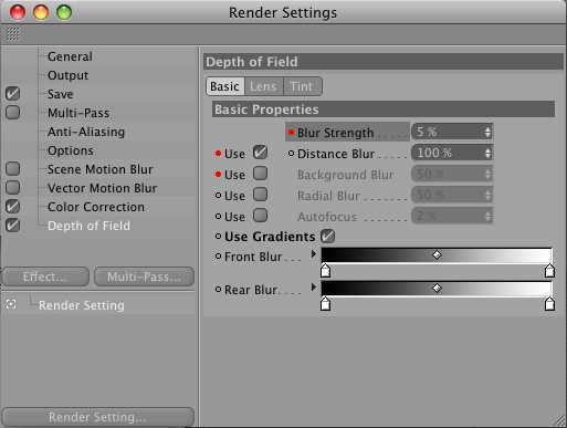 Certains paramètres des effets de post-production peuvent être animés. L'enregistrement des paramètres de post-production fonctionne de la même façon que l'enregistrement des paramètres dans le gestionnaire d'attributs. Pour plus d'informations, voir Gestionnaire d'attributs.