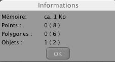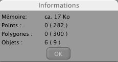 Cette commande affiche les informations suivantes sur la scène : taille en kilo-octets, nombre de points, nombre de polygones et nombre d’objets. Les chiffres en accolades représentent le nombre de points et de polygones qui seront créés si vous autorisez les modifications sur cet objet.