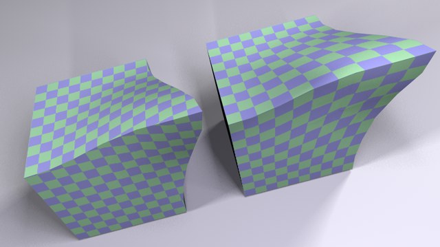 Vous pouvez constater l’effet des coordonnées UVW dans l’image ci-dessus. L’objet de gauche utilise une projection cubique. La texture glisse lorsque l’objet est déformé. En revanche, la texture de l’objet de droite ne glisse pas, puisque sa projection cubique a été fixée avec des coordonnées UVW.
