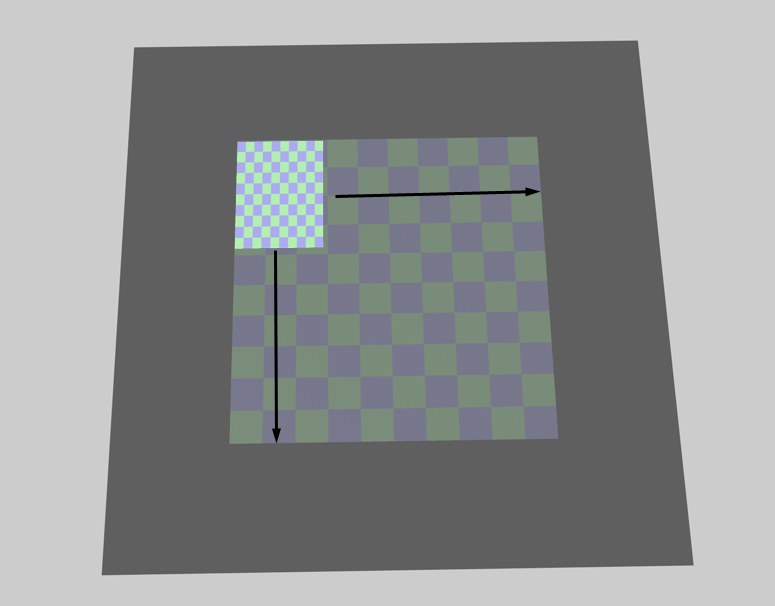 Adapter à la vue fait tourner les axes de texture pour qu’ils soient perpendiculaires à la perspective de la vue (la texture se retrouve donc face au spectateur). Dans le cas d’une vue 3D, il s’agit du plan de caméra. Pour toutes les autres vues, il s’agit de la surface de travail.